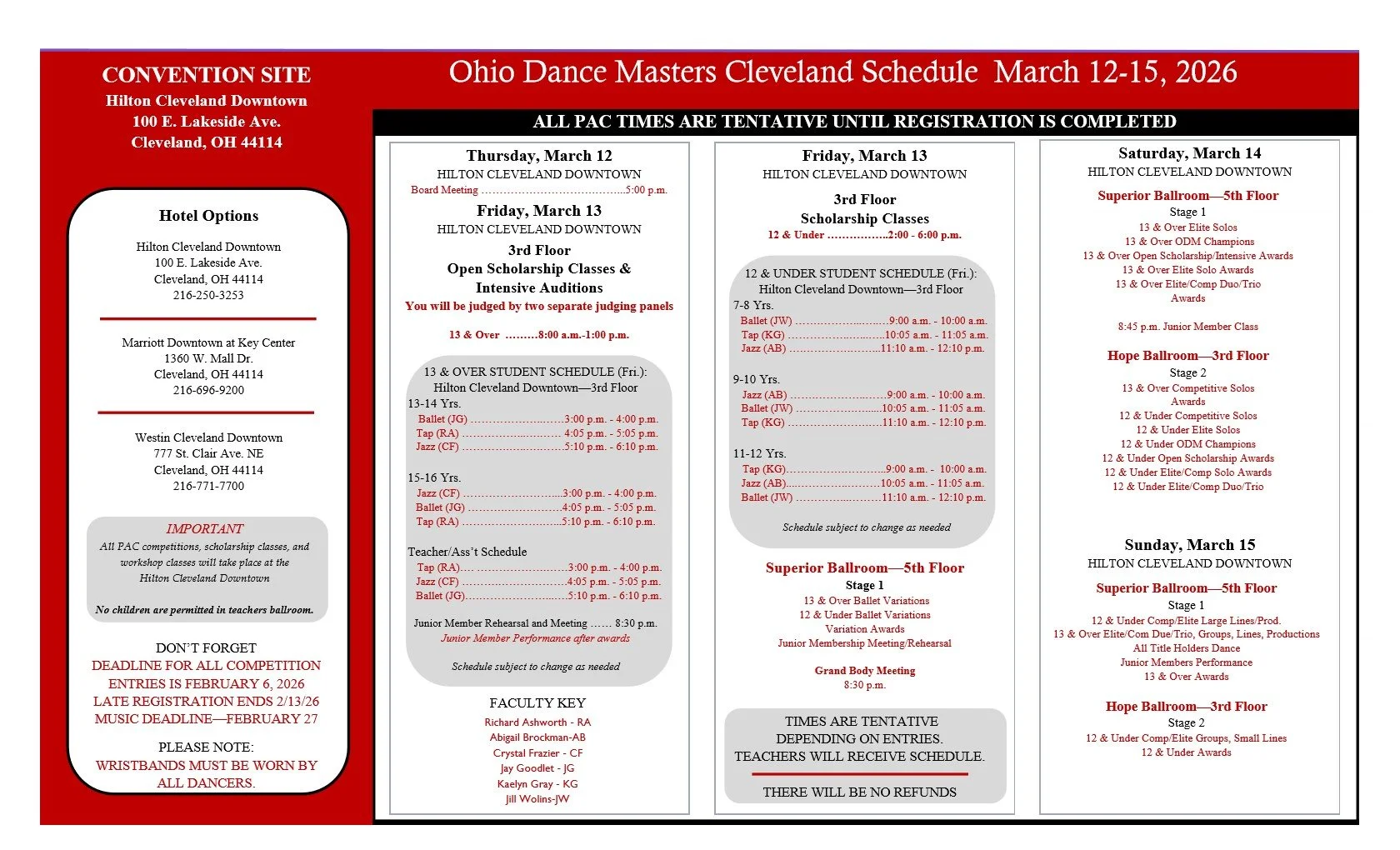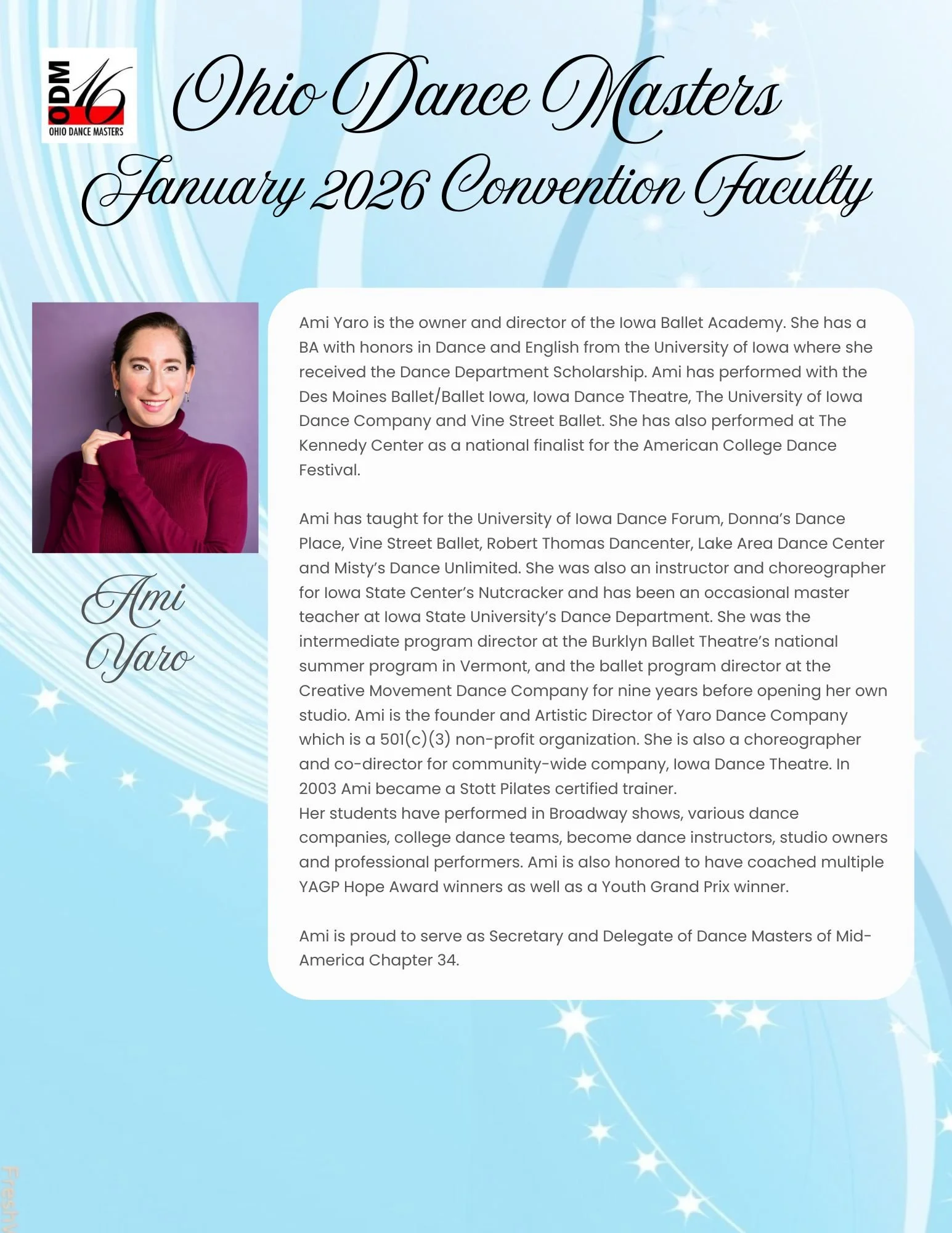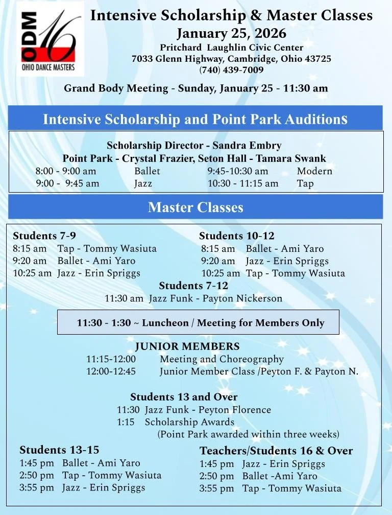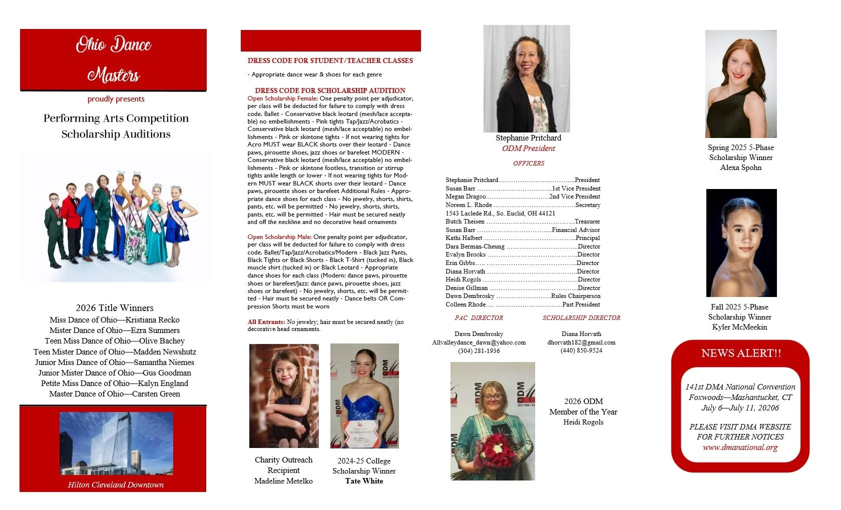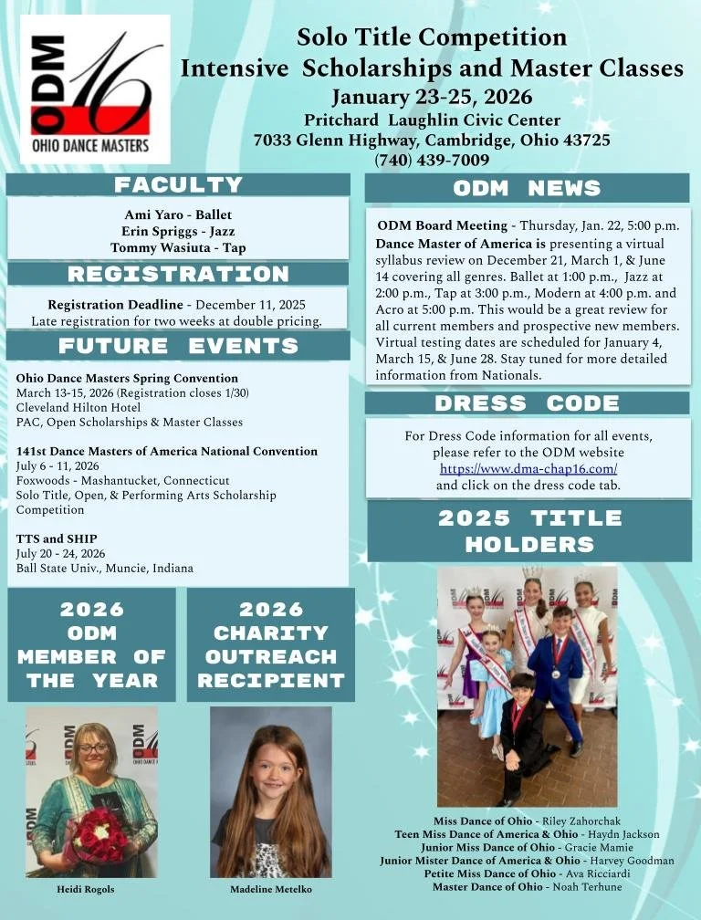 Ohio Dance Masters (ODM) ~ ODMis an association of dance educators certified by examination that was established in 1936. Our focus is to advance the art of dance & improve the practice of teaching. We offer workshops, master classes & training sessions for both teachers & students, as well as Solo Title Competitions, Scholarship Auditions & Performing Arts Competitions.